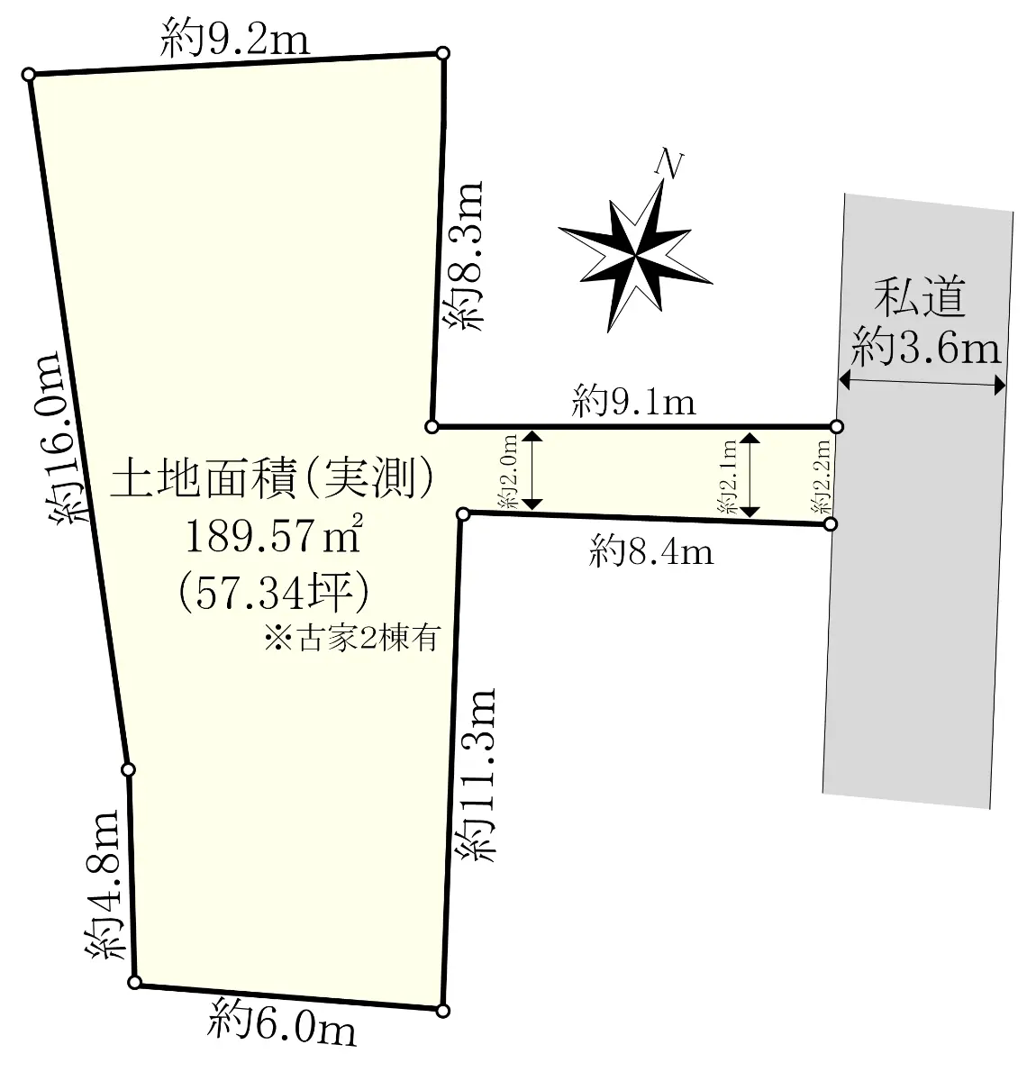 | 土地面積 | 189.57m2(約57.34坪)※実測/路地状部分:19.91m2含む |