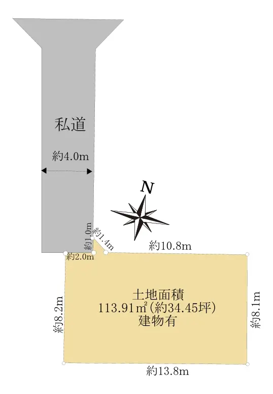 | 接道状況 | 一方道路・北西4m(私道)接面3m |