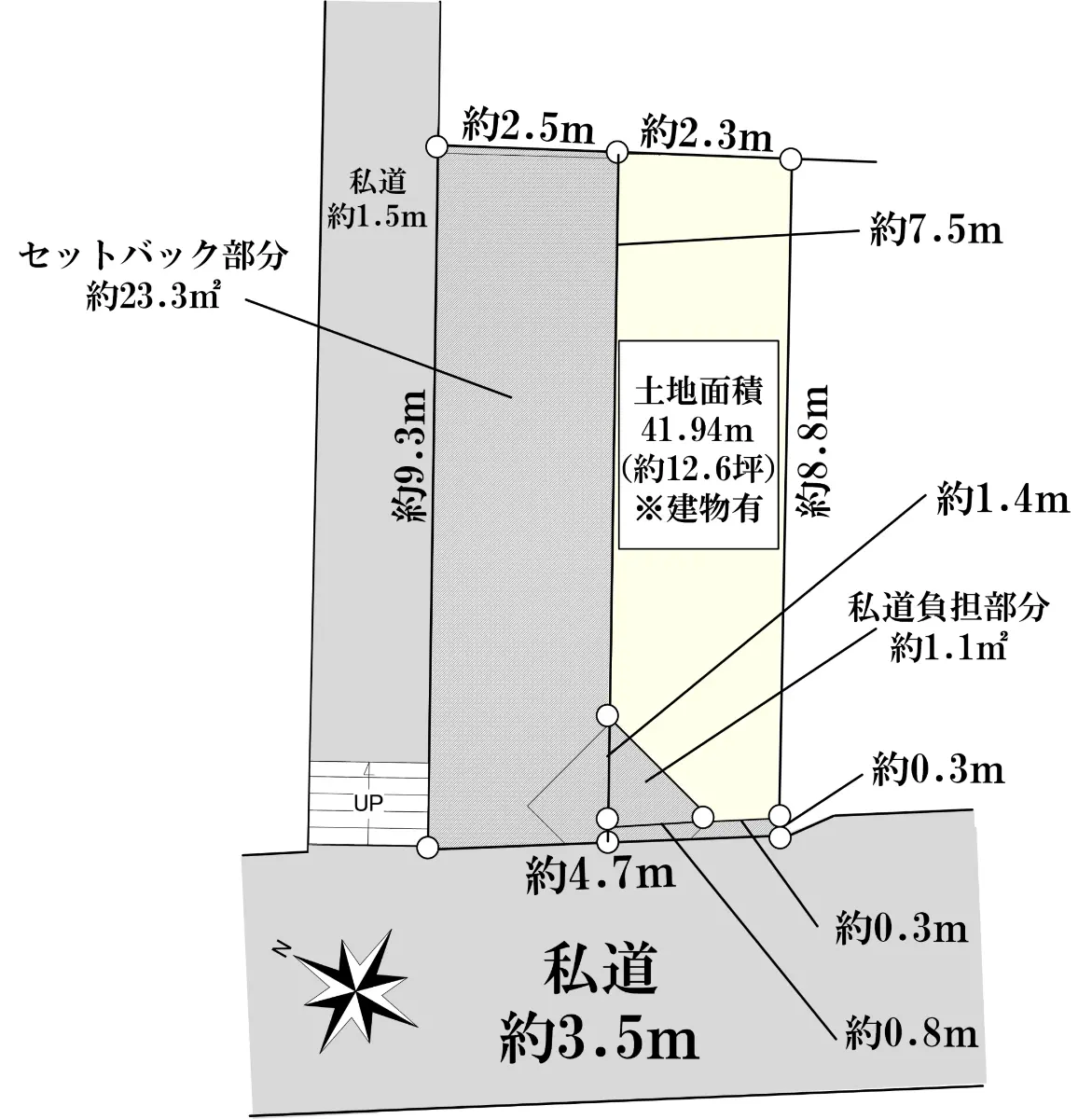| 土地面積 | 41.94m2(約12.68坪)※公簿/セットバック:23.30m2含む |