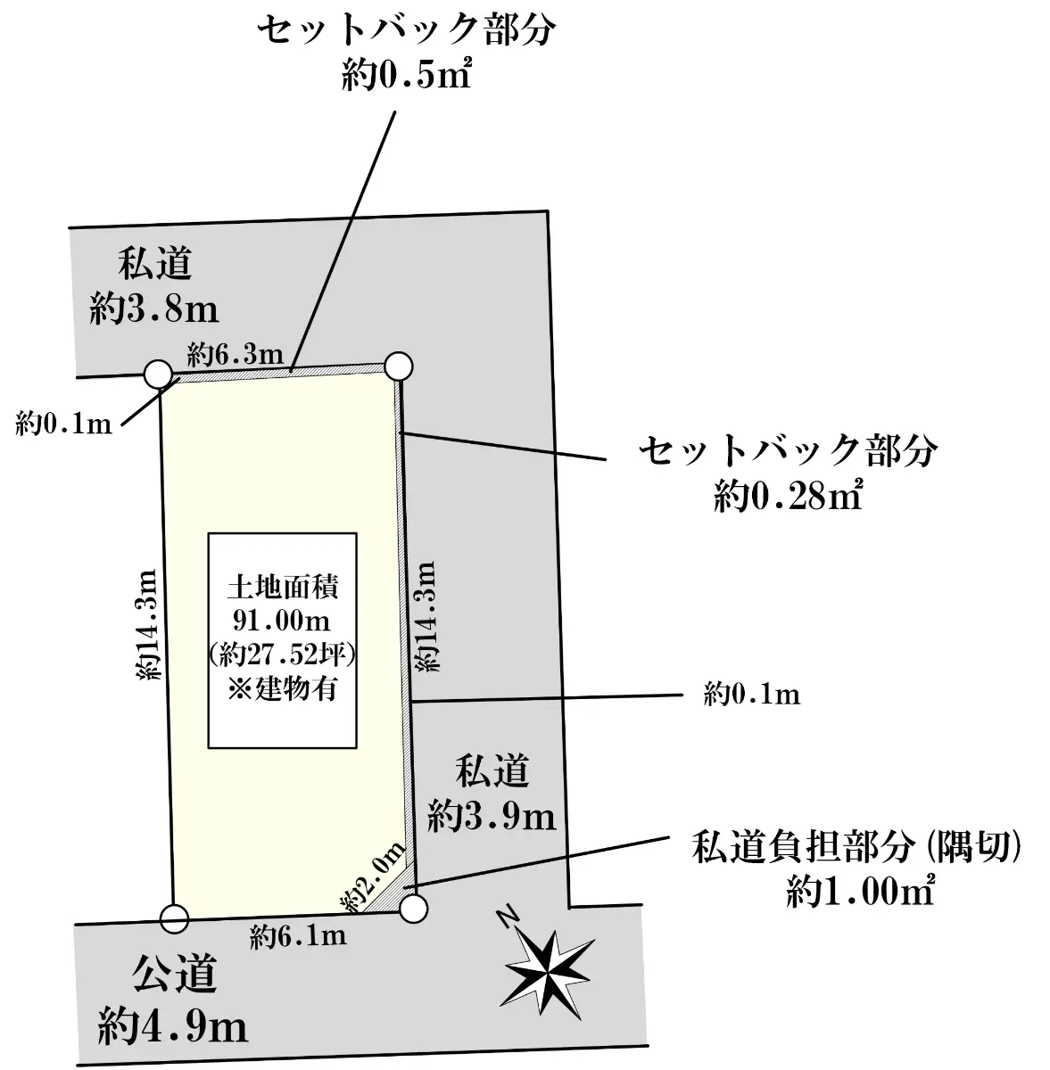 | 土地面積 | 91.00m2(約27.52坪)※公簿/セットバック:0.78m2含む/他に私道負担:14.27m2あり |