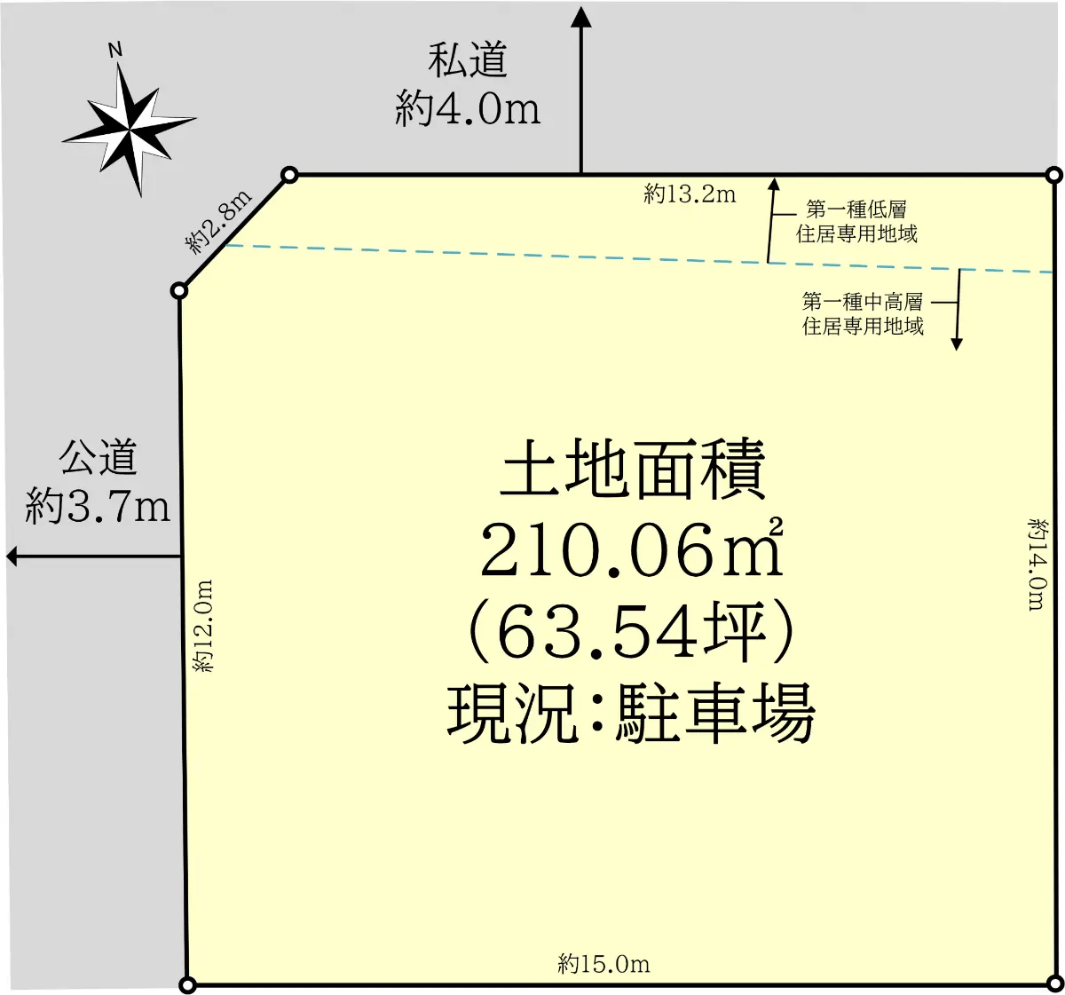 | 接道状況 | 角地・北4m(私道)接面13.2m/西3.7m(公道)接面12m |