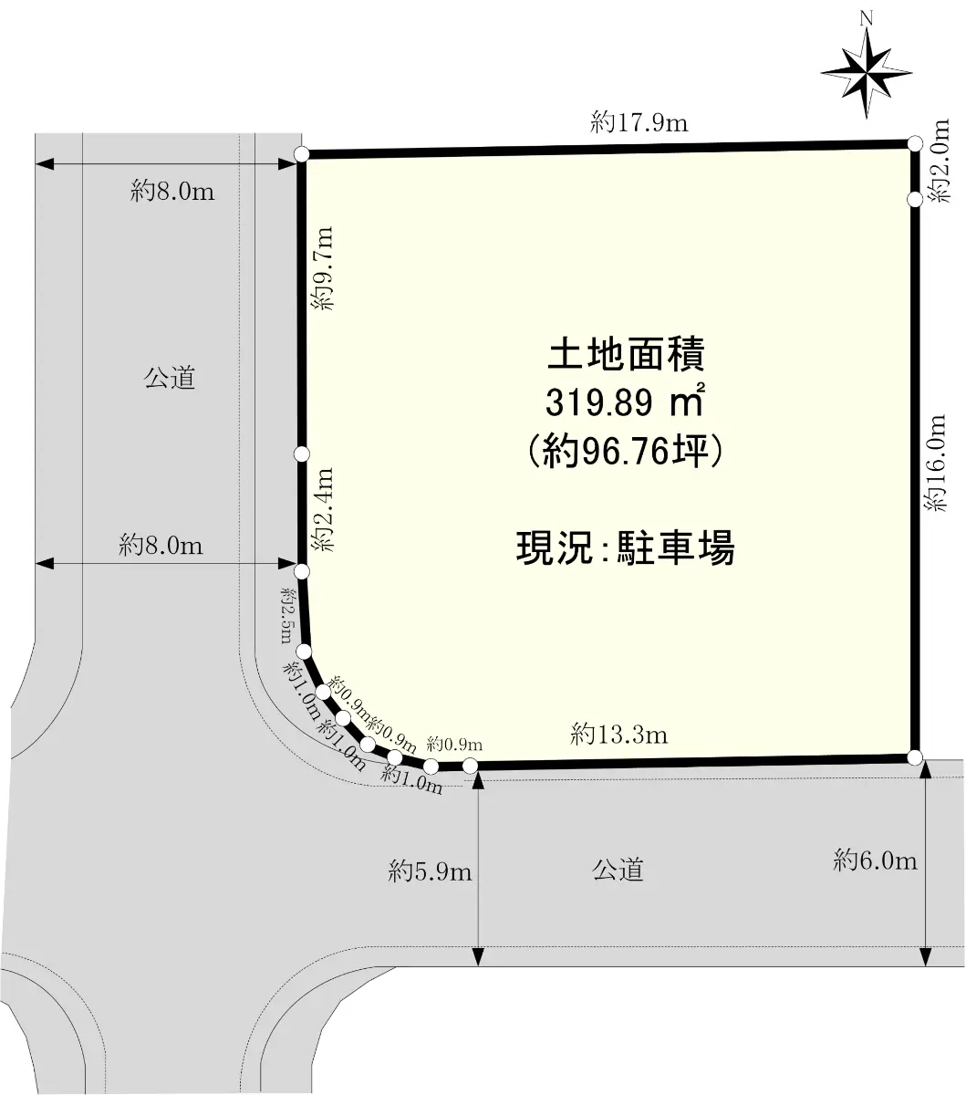 | 接道状況 | 二方道路・西8m(公道)接面14.6m/南5.9m(公道)接面15.2m |