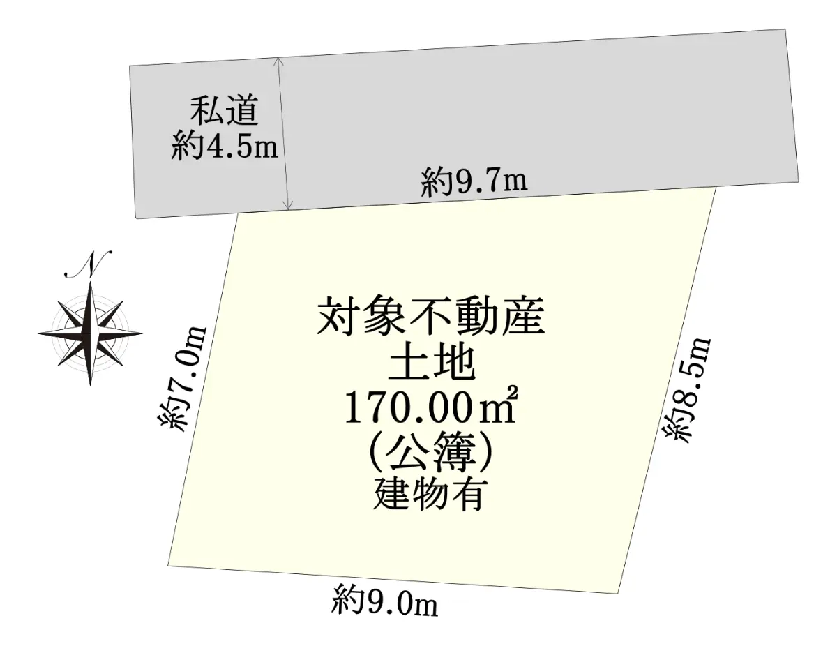 | 接道状況 | 一方道路・北4.5m(私道)接面9.7m |