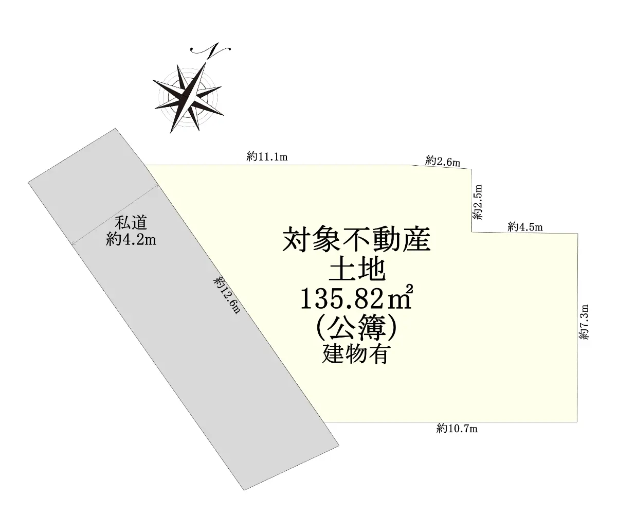 | 接道状況 | 一方道路・南西4.2m(私道)接面12.6m |