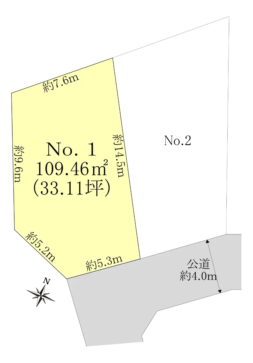 | 接道状況 | 一方道路・南東4m(公道)接面5.3m |