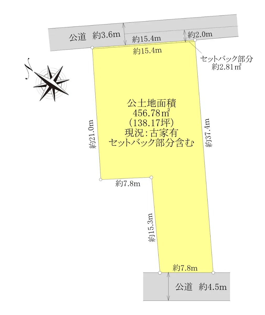 | 土地面積 | 456.78m2(約138.17坪)※公簿/セットバック:2.81m2含む |
