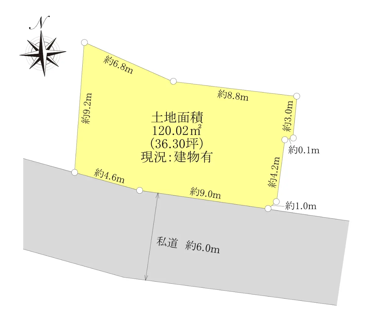 | 接道状況 | 一方道路・南西6m(私道)接面13.6m |