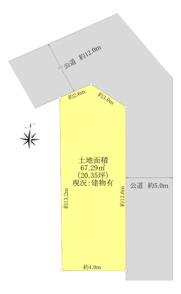 | 接道状況 | 角地・北12m(公道)接面2.6m/東5m(公道)接面15.6m |