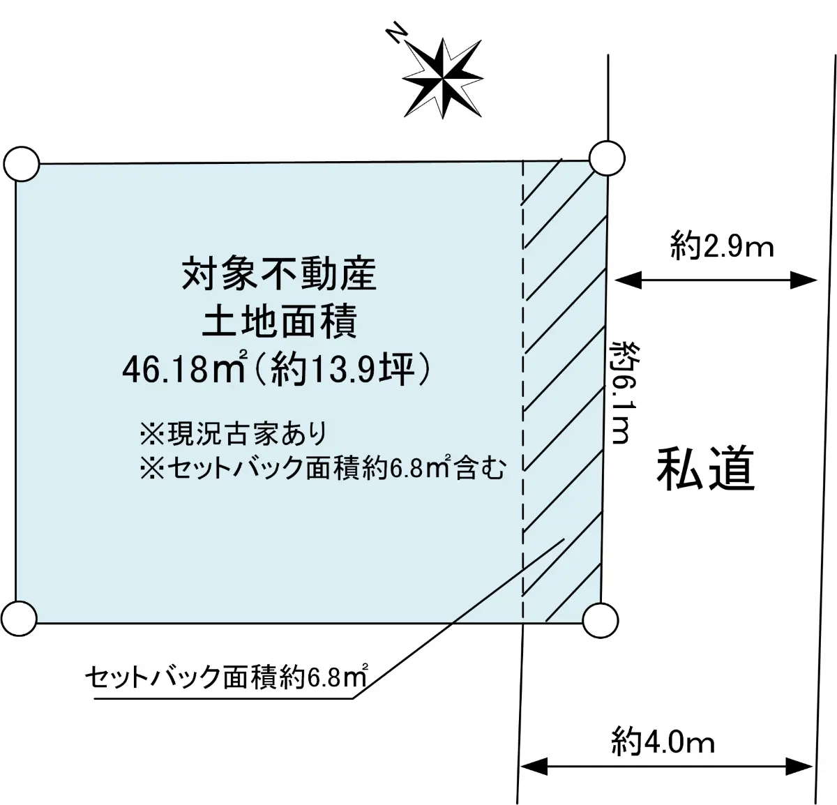 | 土地面積 | 46.18m2(約13.96坪)※公簿/セットバック:6.80m2含む |