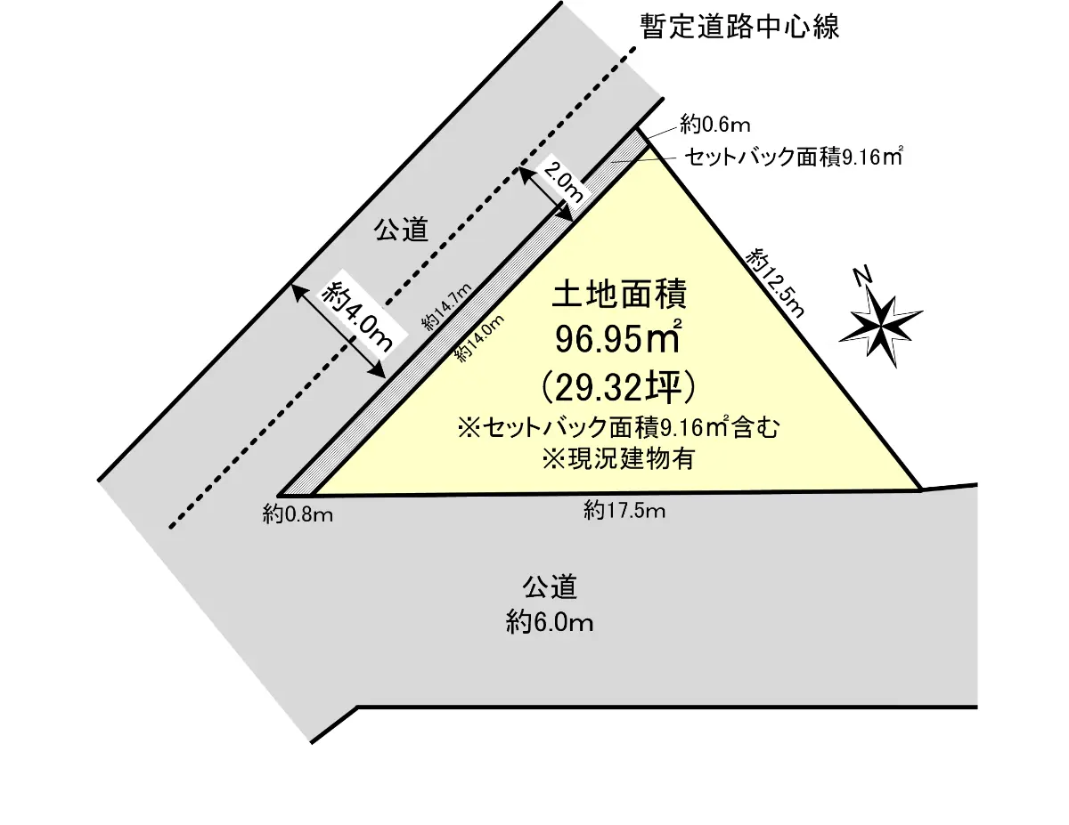 | 接道状況 | 二方道路・南6m(公道)接面17.5m/北西4m(公道)接面14m |