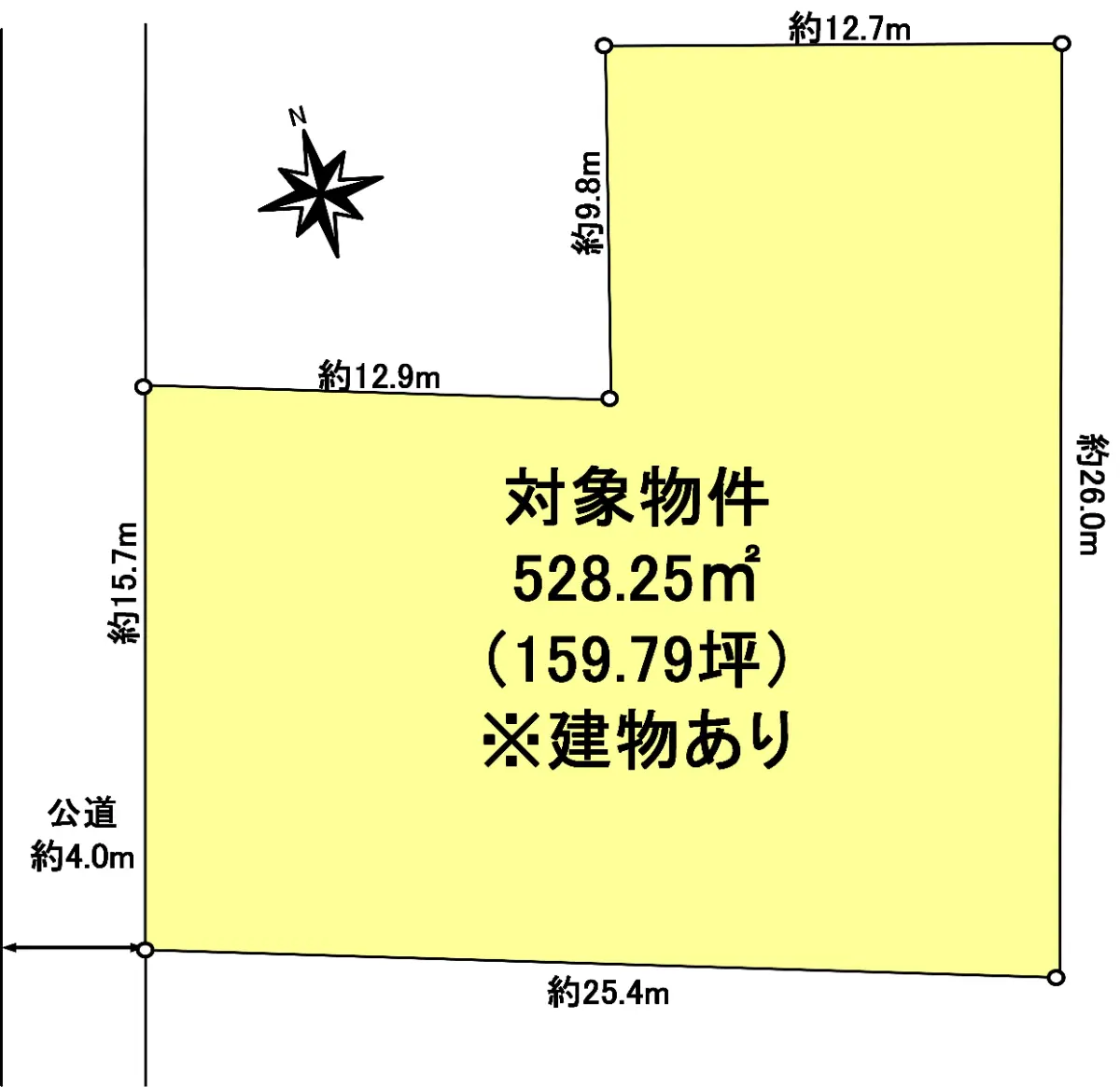 土地面積は528.25u(約159.79坪)、西側公道は幅員約4.0mの土地です。