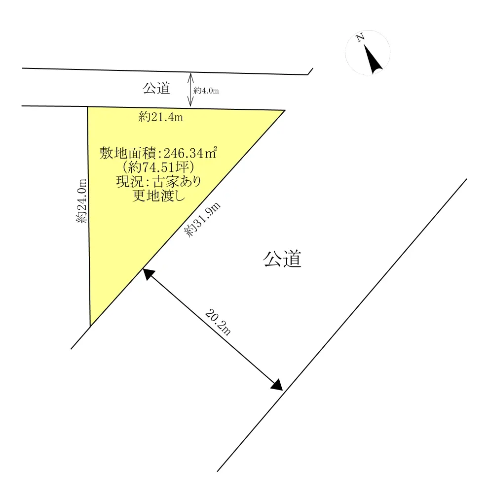 | 接道状況 | 二方道路・南東20.2m(公道)接面31.9m/北4m(公道)接面21.4m |