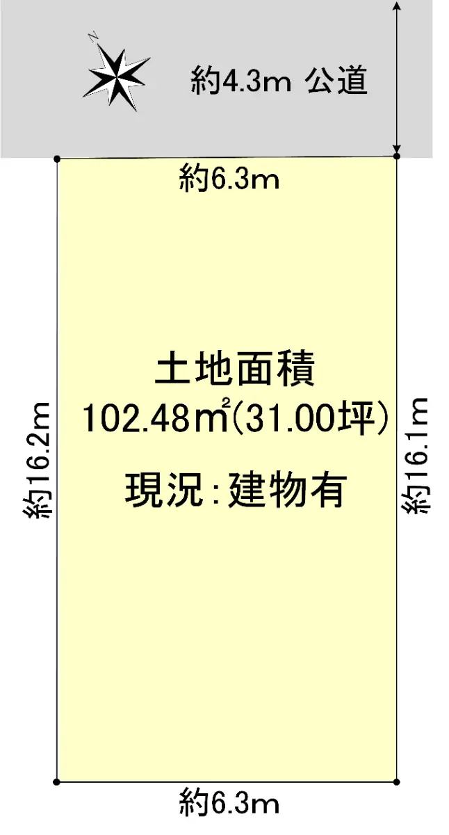 | 接道状況 | 一方道路・北4.3m(公道)接面6.3m |