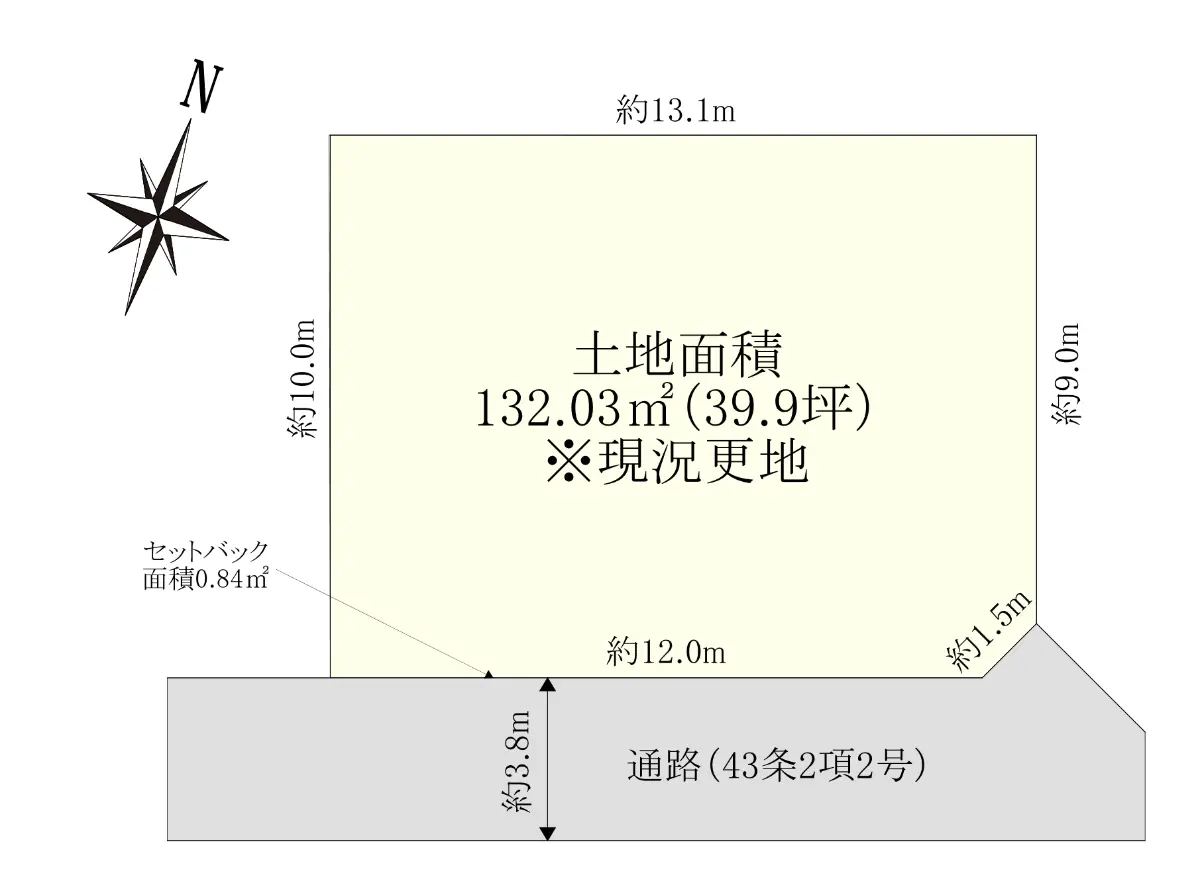 | 土地面積 | 132.03m2(約39.93坪)※実測/セットバック:0.84m2含む/他に私道負担:18.29m2あり |