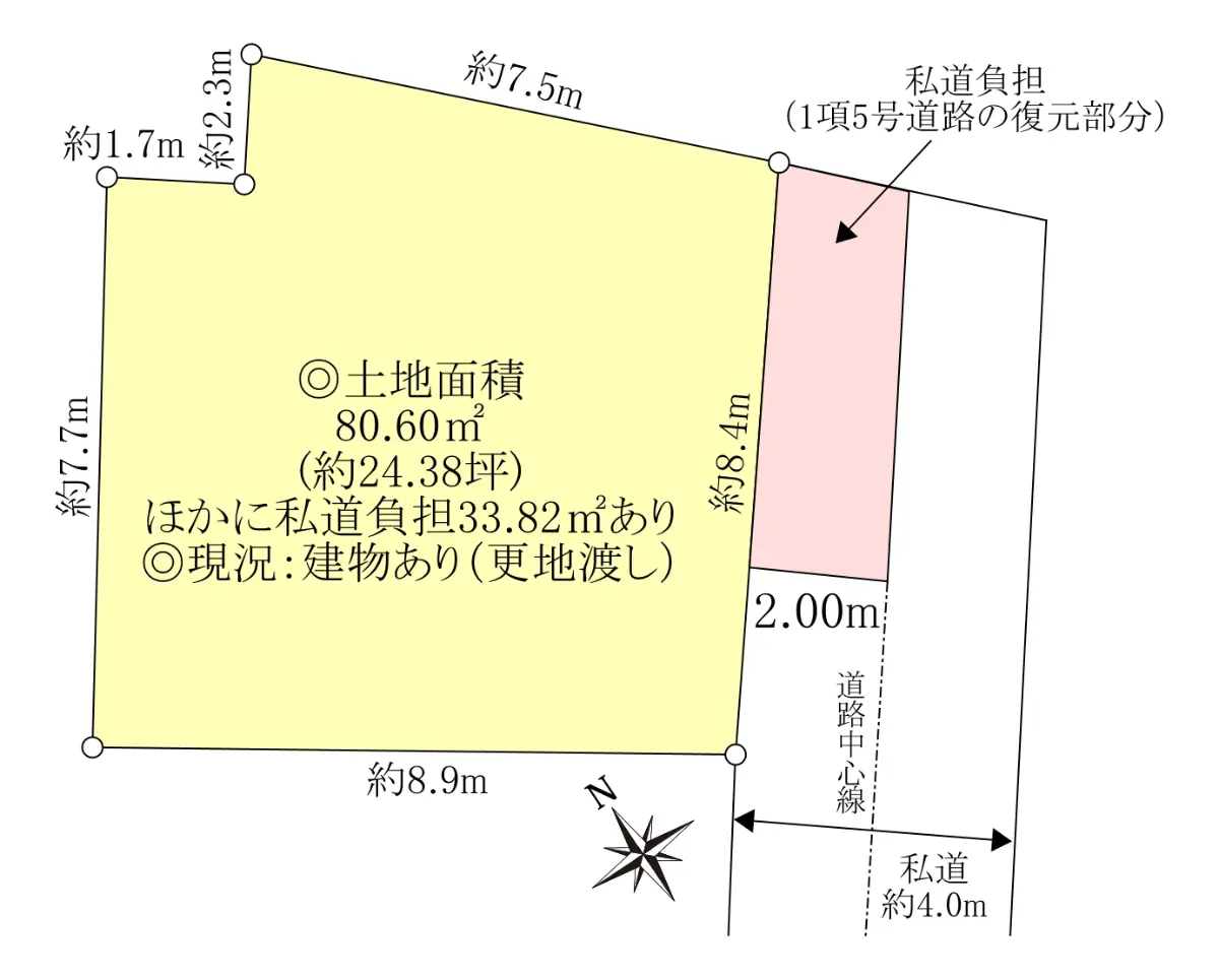 | 接道状況 | 一方道路・南東4m(私道)接面8.4m |