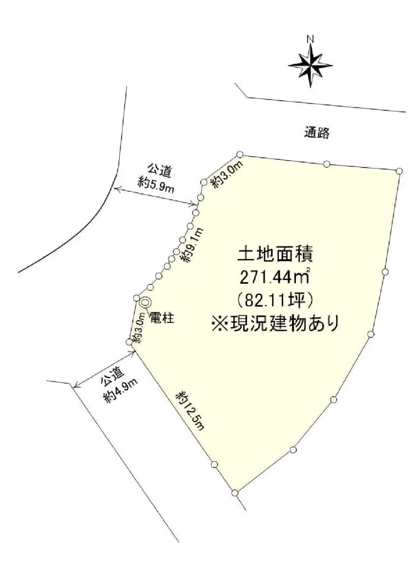 | 接道状況 | 角地・北西5.9m(公道)接面9.1m/南西4.9m(公道)接面12.5m |