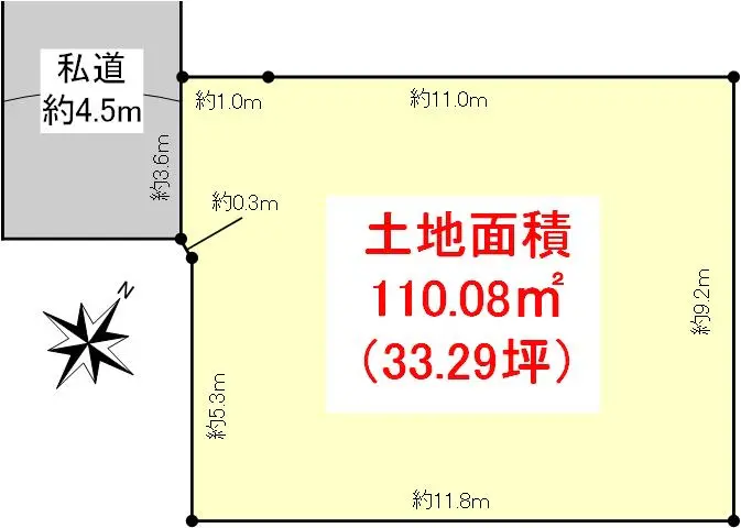 | 土地面積 | 110.08m2(約33.29坪)※公簿/他に私道負担:12.12m2あり |