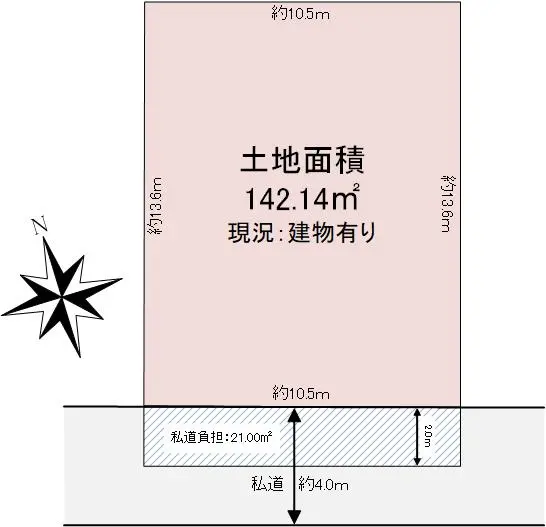| 土地面積 | 142.14m2(約42.99坪)※公簿/他に私道負担:21.00m2あり |