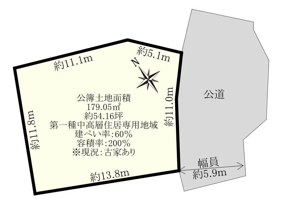 | 接道状況 | 一方道路・南東5.9m(公道)接面11m |