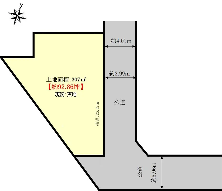 | 接道状況 | 一方道路・北東3.9m(公道)接面26.1m |
