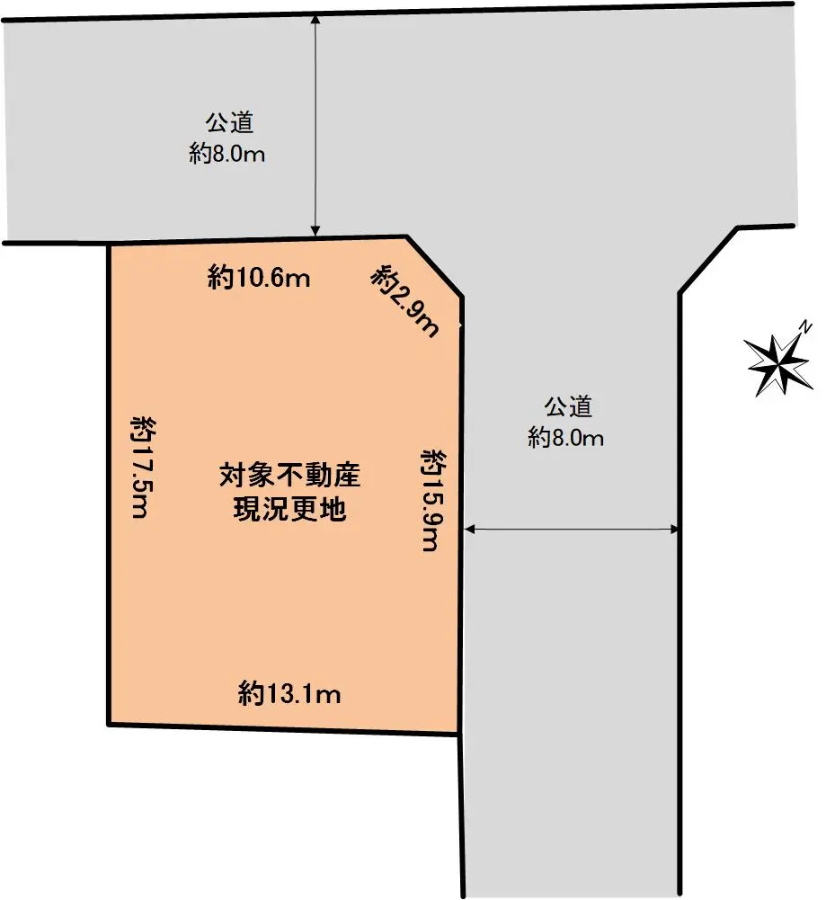 | 接道状況 | 角地・北西8m(公道)接面10.6m/北東8m(公道)接面15.9m |
