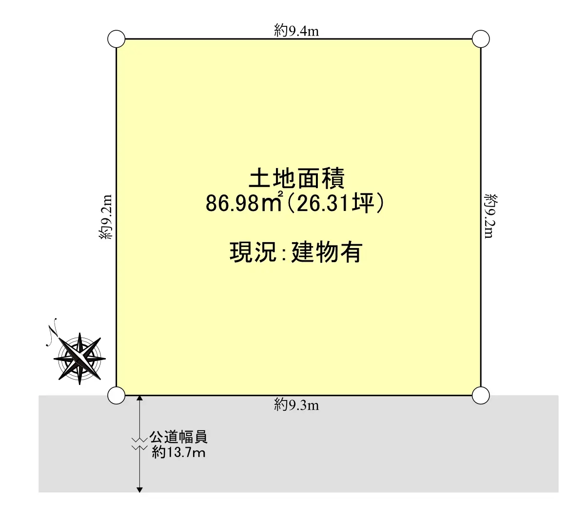 南西の公道(幅員約13.7m)に面しており、土地面積は86.98u(26.31坪)です。