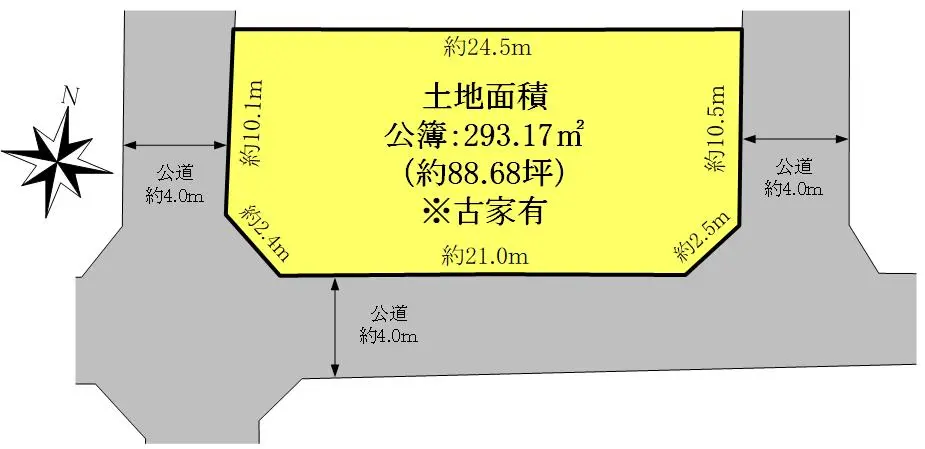 | 接道状況 | 三方道路・南4m(公道)接面21m/西4m(公道)接面10.1m/東4m(公道)接面10.5m |