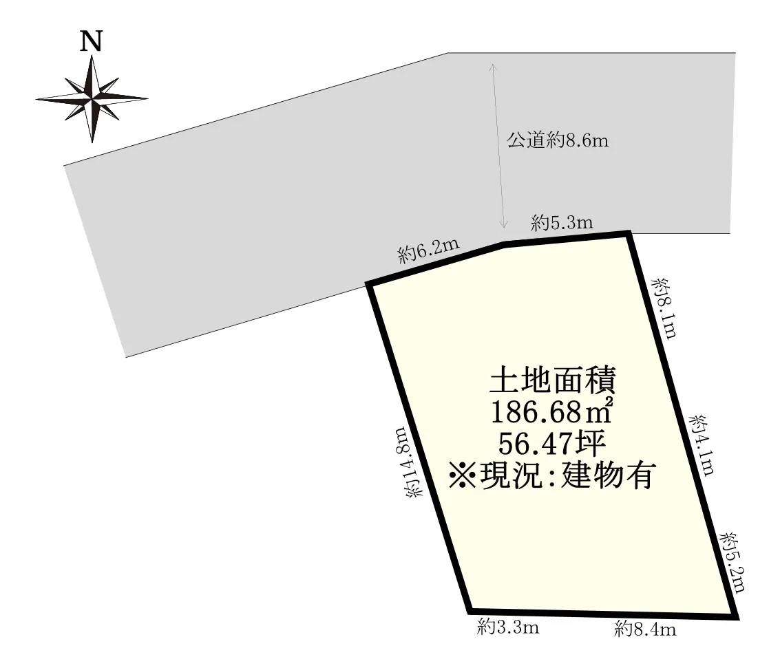 | 接道状況 | 一方道路・北8.6m(公道)接面11.5m |