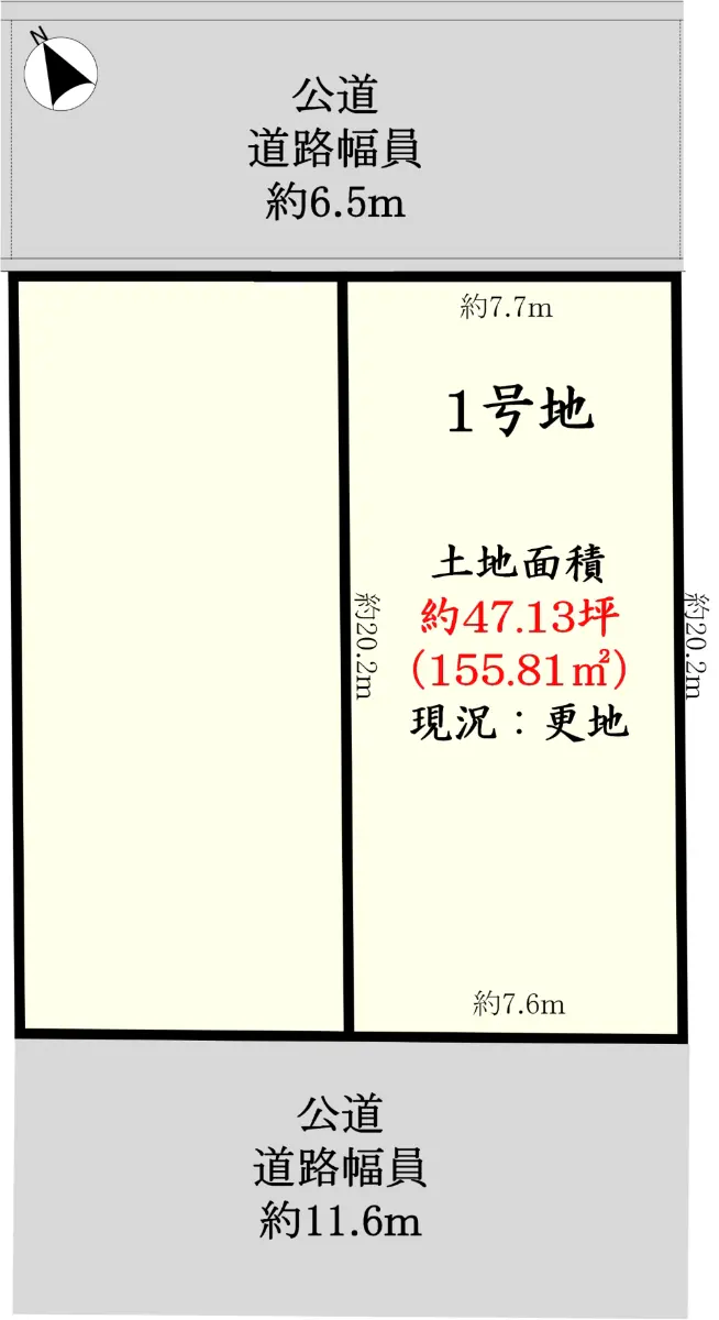 | 接道状況 | 二方道路・北東6.5m(公道)接面7.7m/南西11.6m(公道)接面7.6m |