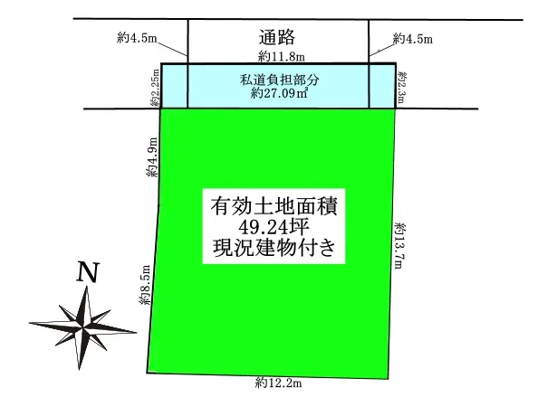 土地面積162.78m2(約49.24坪)/他に私道負担:27.09m2あり・建ぺい率60%・容積率160% ※前面道路幅員による制限