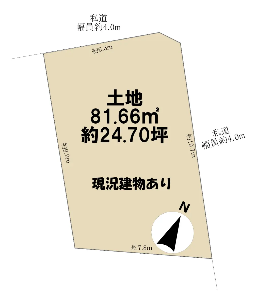 | 接道状況 | 角地・北東4m(私道)接面10.7m/北西4m(私道)接面6.5m |