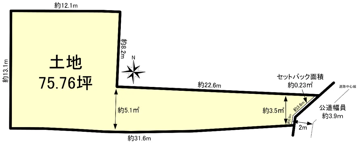 | 土地面積 | 250.47m2(約75.76坪)※実測/セットバック:0.23m2含む/路地状部分:90.00m2含む |