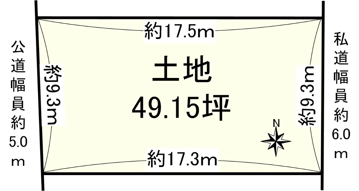 | 接道状況 | 二方道路・東6m(私道)接面9.3m/西5m(公道)接面9.3m |