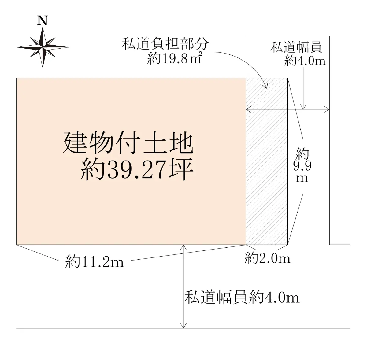 | 接道状況 | 二方道路・東4m(私道)接面9.9m/南4m(私道)接面11.2m |