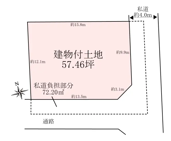| 接道状況 | 一方道路・東4m(私道)接面9.9m |