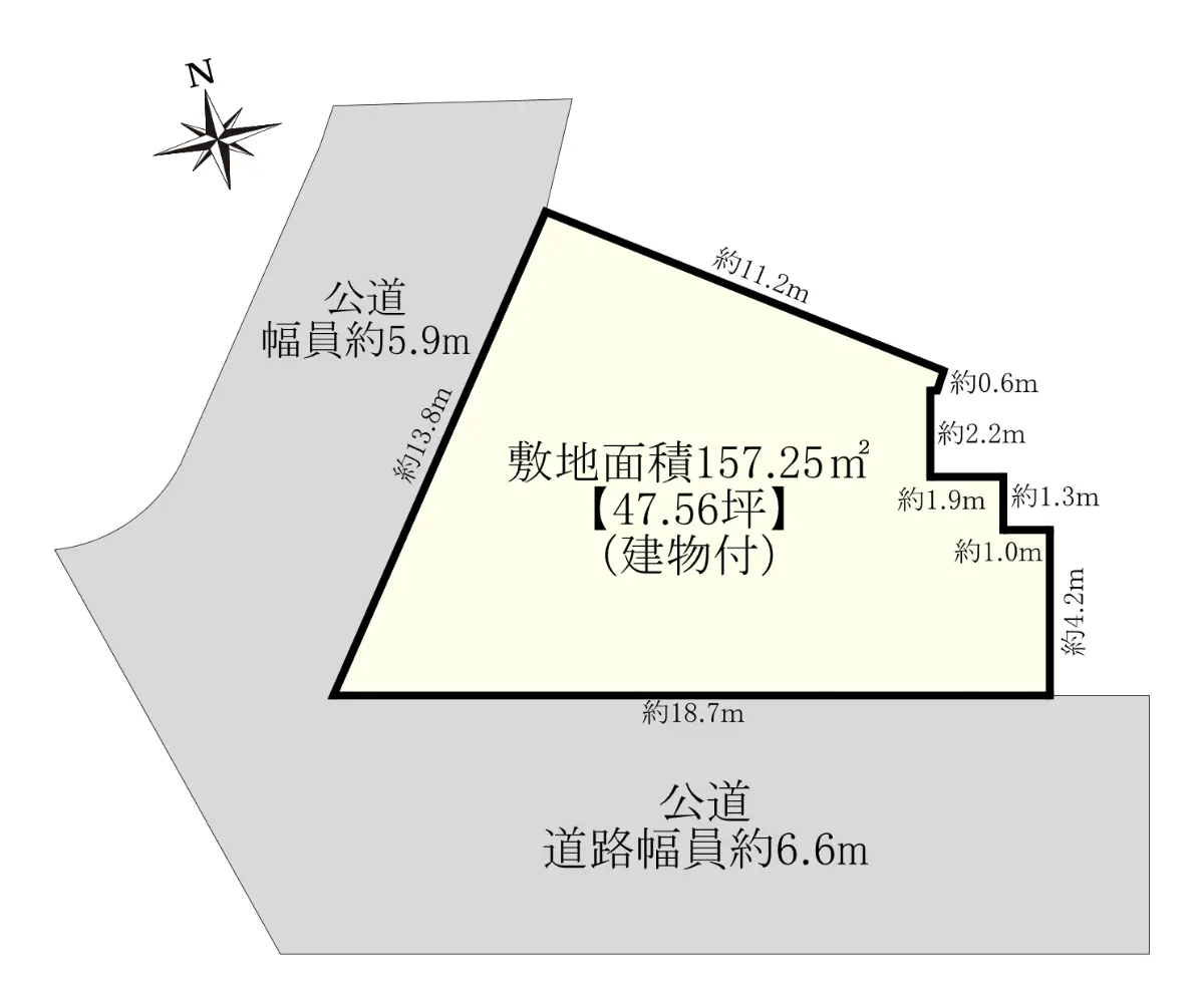 | 接道状況 | 角地・南6.6m(公道)接面18.7m/北西5.9m(公道)接面13.8m |