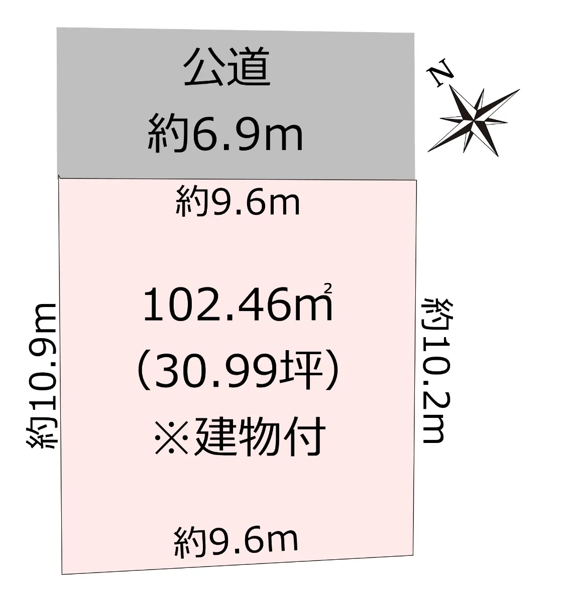 土地面積:30.99坪、間口:約9.6mです。