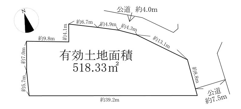 | 接道状況 | 角地・南東7.5m(公道)接面8.8m/北東4m(公道)接面29m |