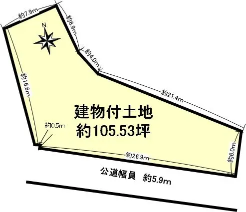| 接道状況 | 一方道路・南西5.9m(公道)接面26.9m |