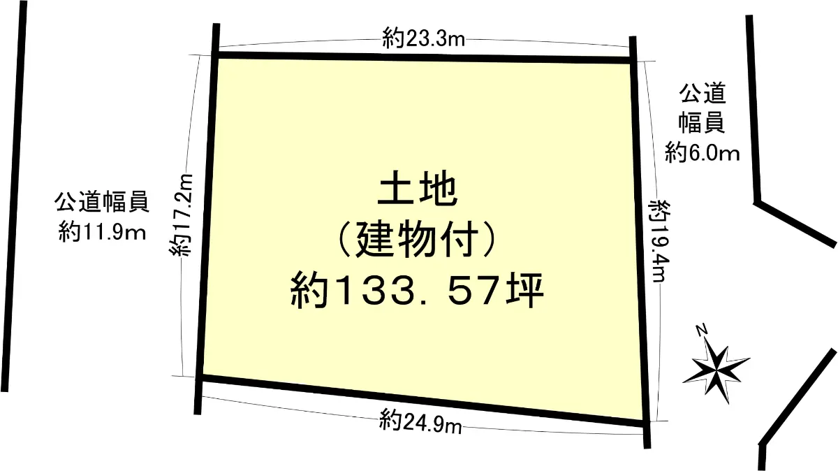 | 接道状況 | 二方道路・南東6m(公道)接面19.4m/北西11.9m(公道)接面17.2m |