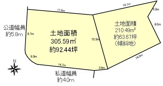 | 接道状況 | 二方道路・西5.8m(公道)接面17.7m/南4m(私道)接面14.7m |