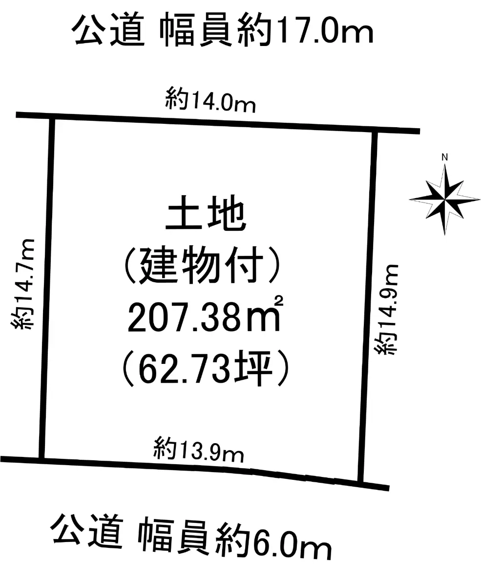 | 接道状況 | 二方道路・南6m(公道)接面13.9m/北17m(公道)接面14m |