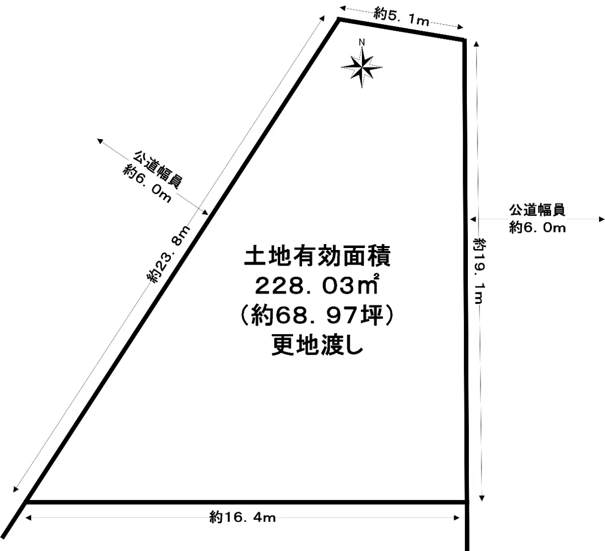 | 接道状況 | 角地・東6m(公道)接面19.1m/北西6m(公道)接面23.8m |