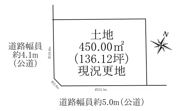 土地面積(公簿)450.00u(136.12坪)、前面道路幅員約5.0m、間口約23.3mの現況更地です。