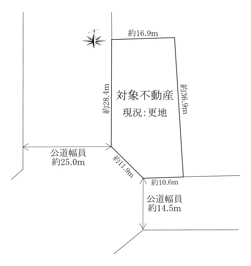 | 接道状況 | 角地・西25m(公道)接面28.4m/南14.5m(公道)接面10.6m |