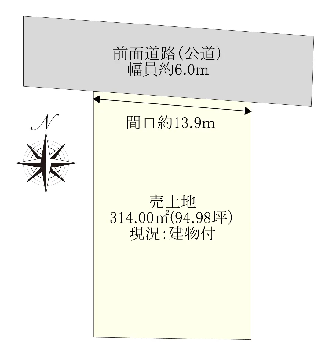 | 接道状況 | 一方道路・北6m(公道)接面13.9m |