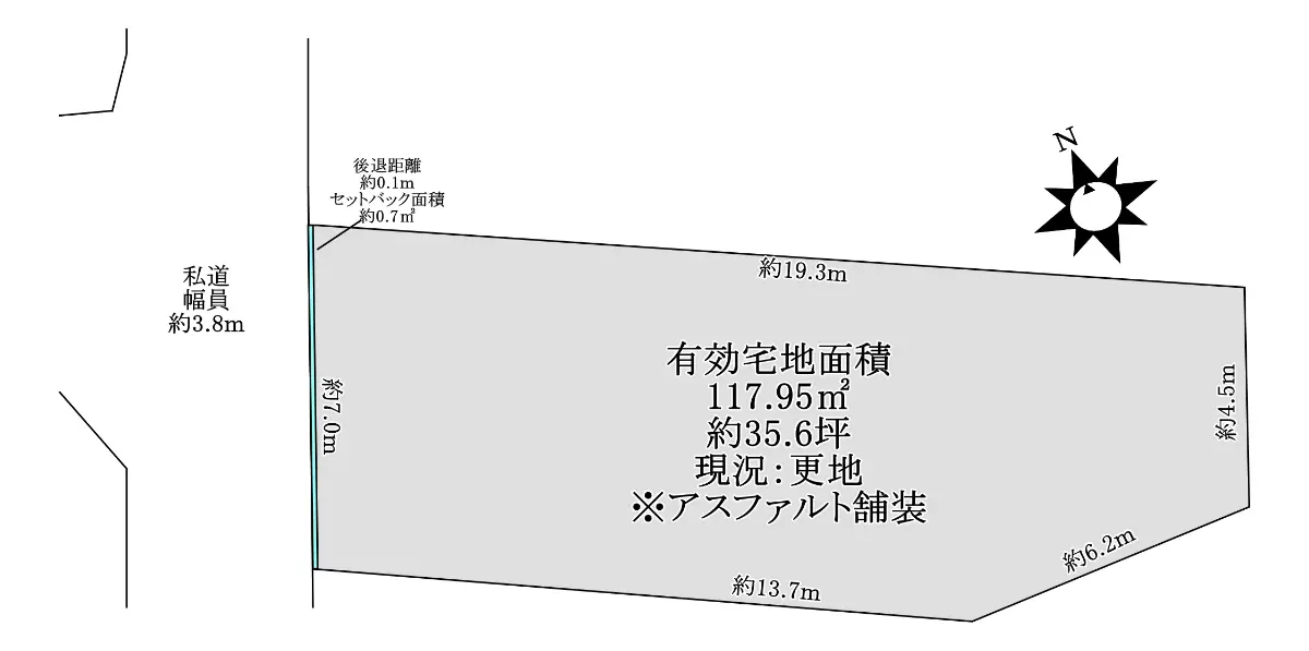 | 土地面積 | 117.95m2(約35.67坪)/セットバック:0.70m2含む/他に私道負担:13.90m2あり |