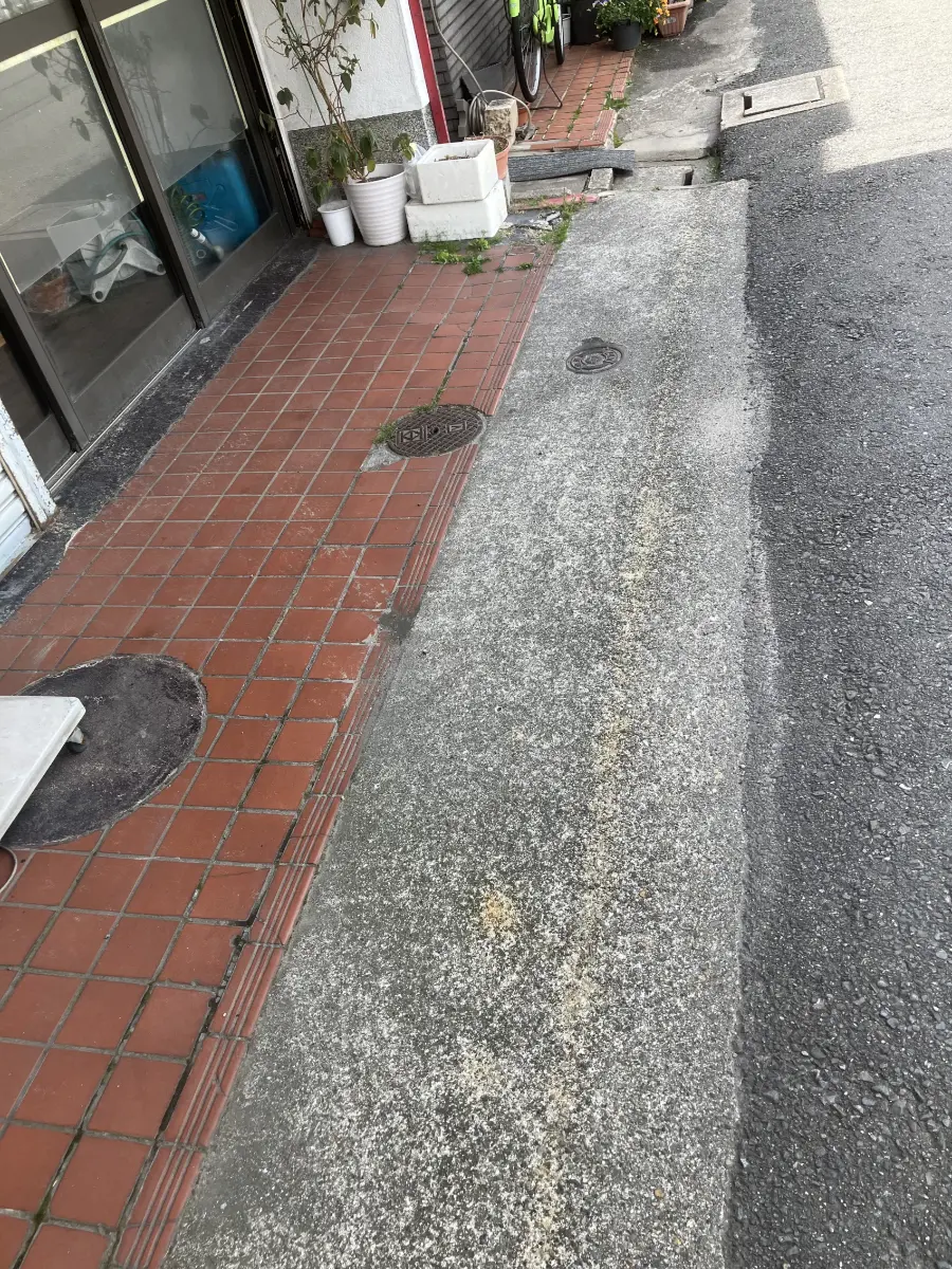 敷地と道路の高低差のない平坦地の物件です。前面道路は公道です。