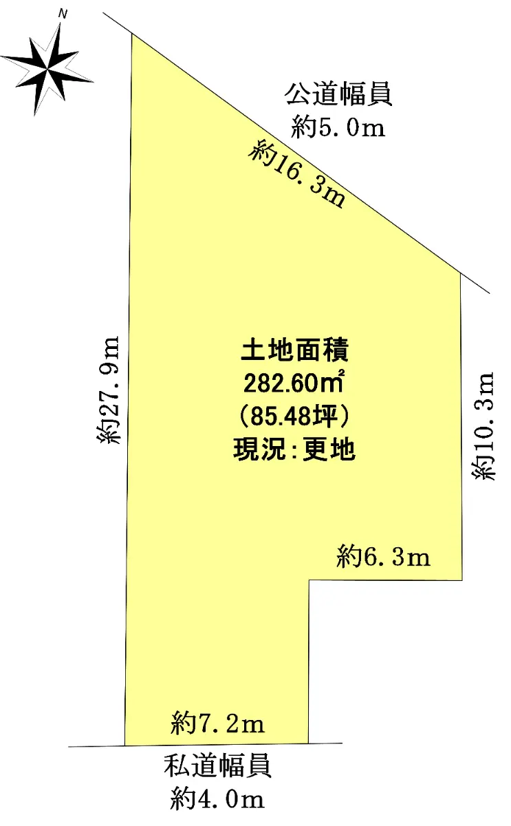 | 接道状況 | 二方道路・北東5m(公道)接面16.3m/南4m(私道)接面7.2m |