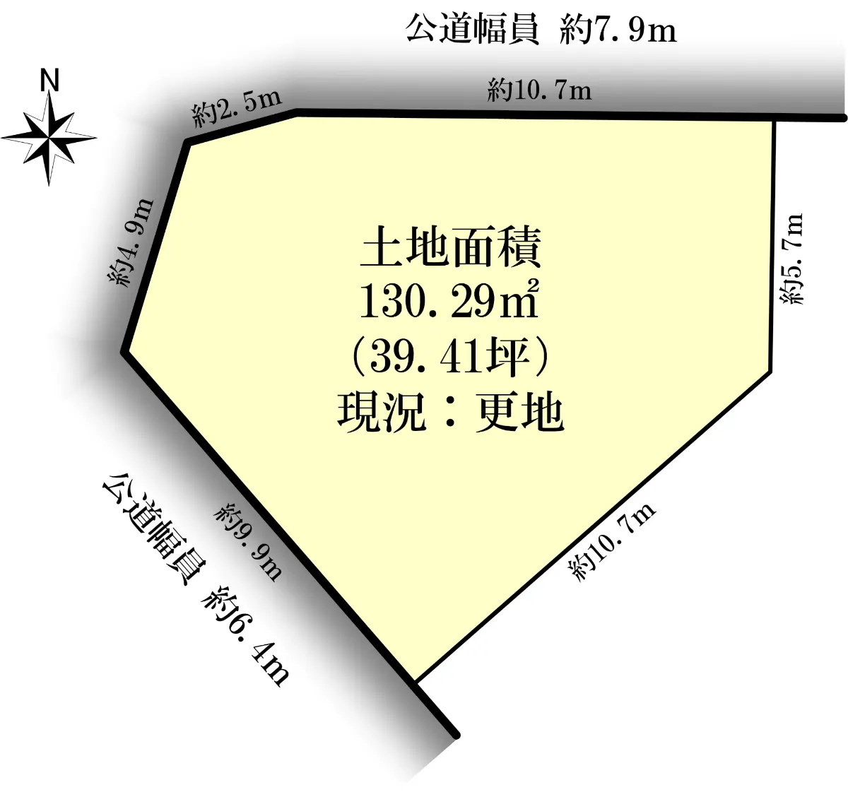 | 接道状況 | 二方道路・北7.9m(公道)接面10.7m/南西6.4m(公道)接面9.9m |